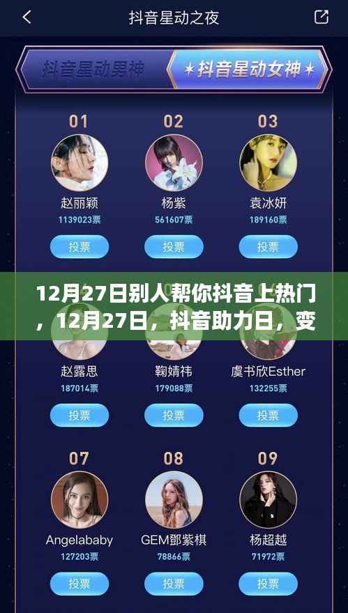 在这个快节奏的时代,抖音已经成为我们展示自我和实现梦想的重要舞台,或许在12月27日之前,你已经在抖音上分享了许多精彩瞬间,但今天,我们将迎来一个特别的契机,或许有人会帮你助推一把,让你的作品上热门,这是一个难得的机会,让我们抓住它,展翅飞翔!
